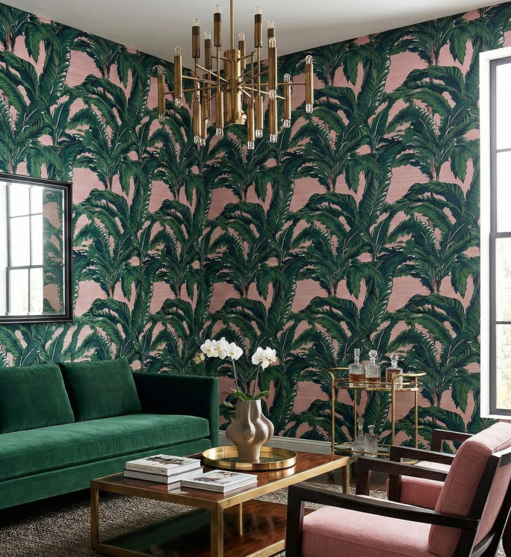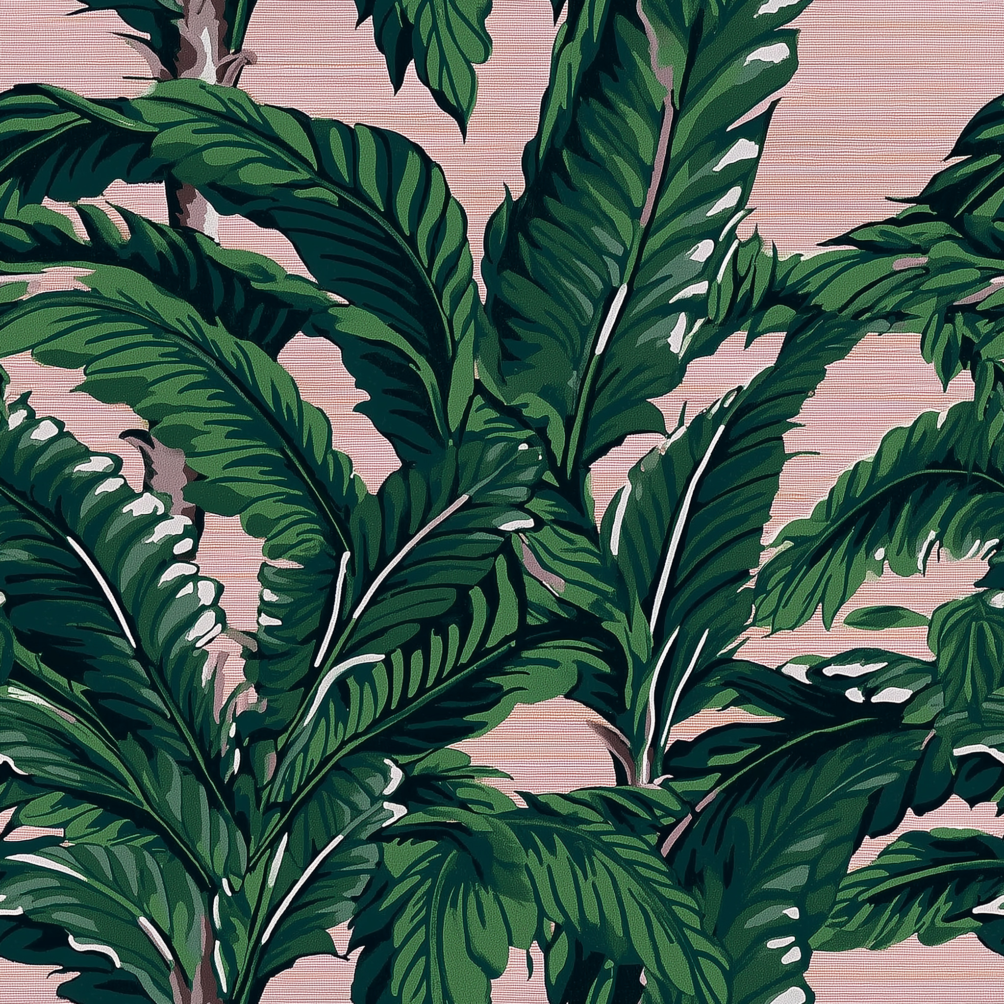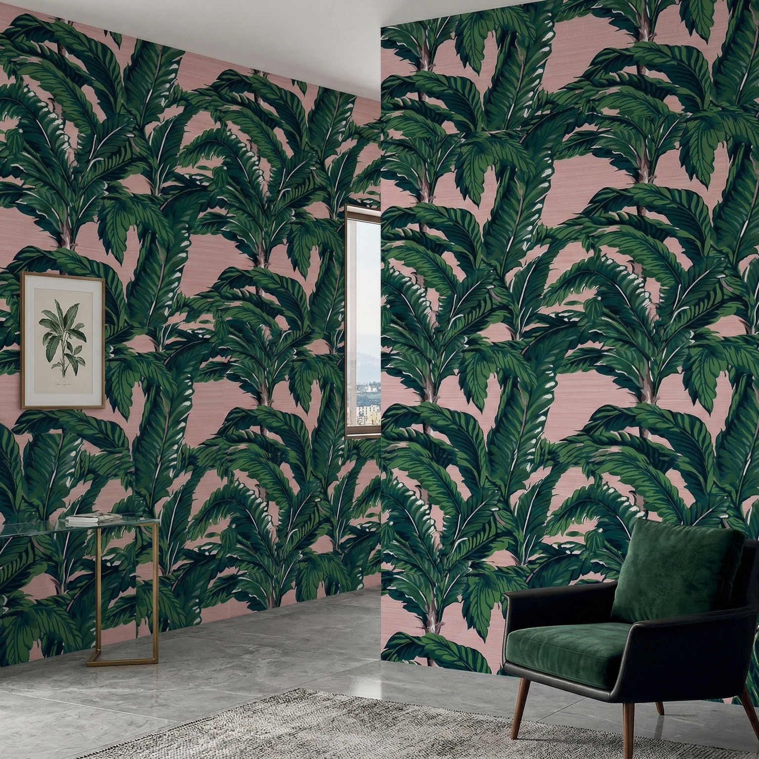 The bold foliage contrasts beautifully with the soft, dusty pink background, which features a subtle horizontal linear texture reminiscent of classic grass cloth or raw silk. It is the perfect choice for creating a maximalist powder room, a vibrant sunroom, or a chic entryway that demands attention.