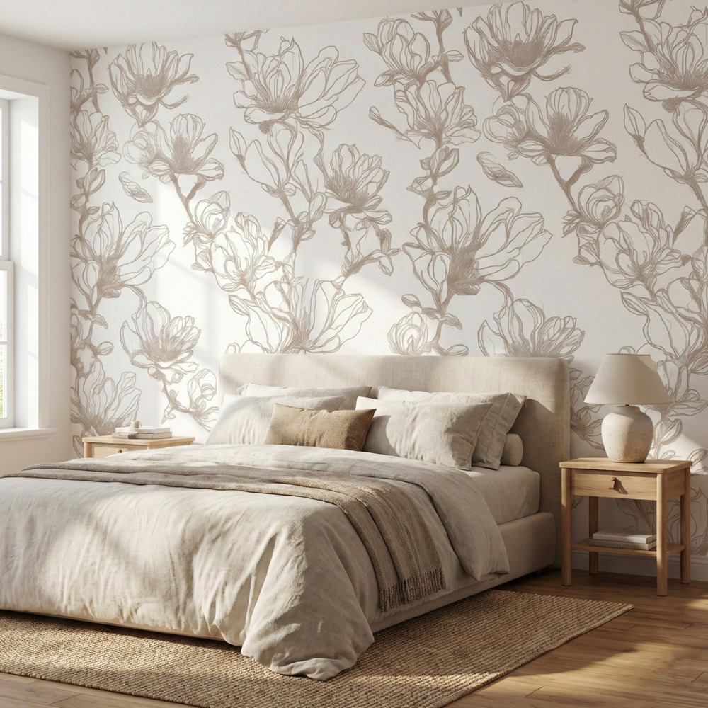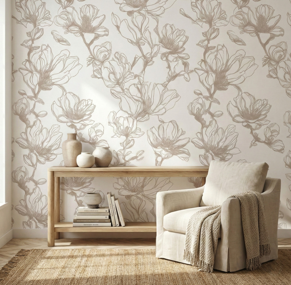 Embrace minimalist luxury with the Champagne Magnolia Contour Mural. This large-scale mural transforms your wall into a sweeping canvas of hand-drawn botanical art, showcasing graceful branches of oversized blooming flowers and falling petals rendered in continuous, fluid contour lines.