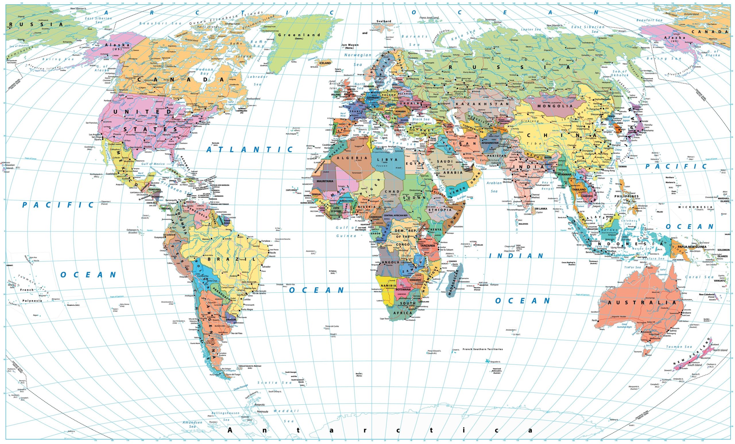 Meticulously labeled with country names, major cities, and ocean titles, this mural serves as an excellent reference tool. The clean white background, accented by subtle blue grid lines for latitude and longitude, ensures the design feels modern and bright, preventing it from overpowering the room. It is the perfect feature wall for a home office, a child’s study, or a classroom, inspiring curiosity and a love for travel.
