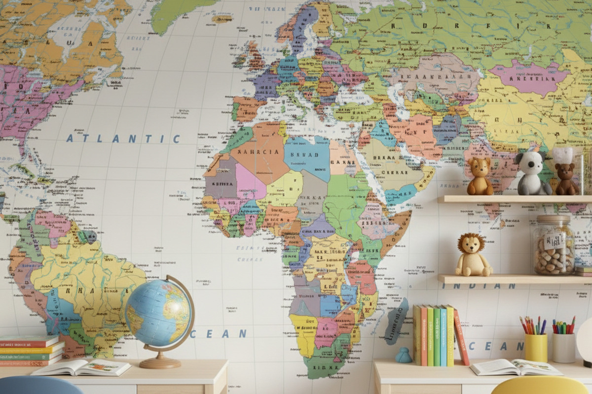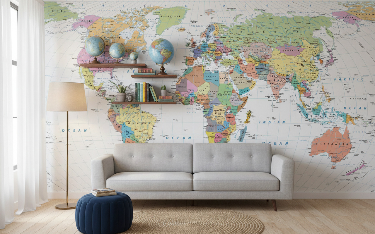 Transform your wall into a window to the world with the Classic Atlas World Map Mural. This comprehensive wall covering features a traditional political projection, offering a clear and educational view of the globe. Countries are distinguished by soft, contrasting pastel tones—including shades of apricot, sage, lavender, and yellow—making it easy to identify borders and territories at a glance.