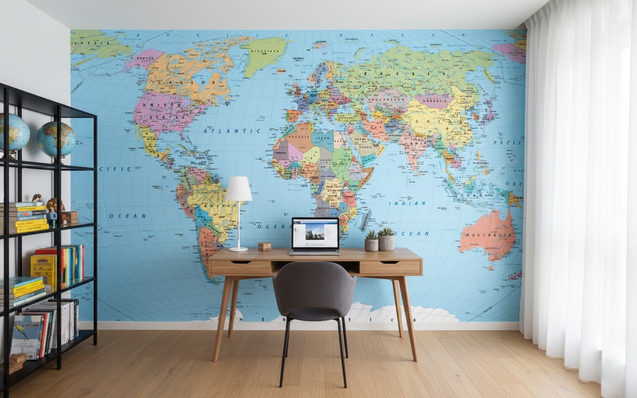 The standout feature of this version is the soothing, light blue ocean background, which provides a classic atlas look and makes the landmasses pop. Essential geographic details—including country names, capital cities, and major ocean labels—are legible and precise. Ideally suited for educational environments, home offices, or a traveler’s bedroom, this mural combines learning with timeless style.