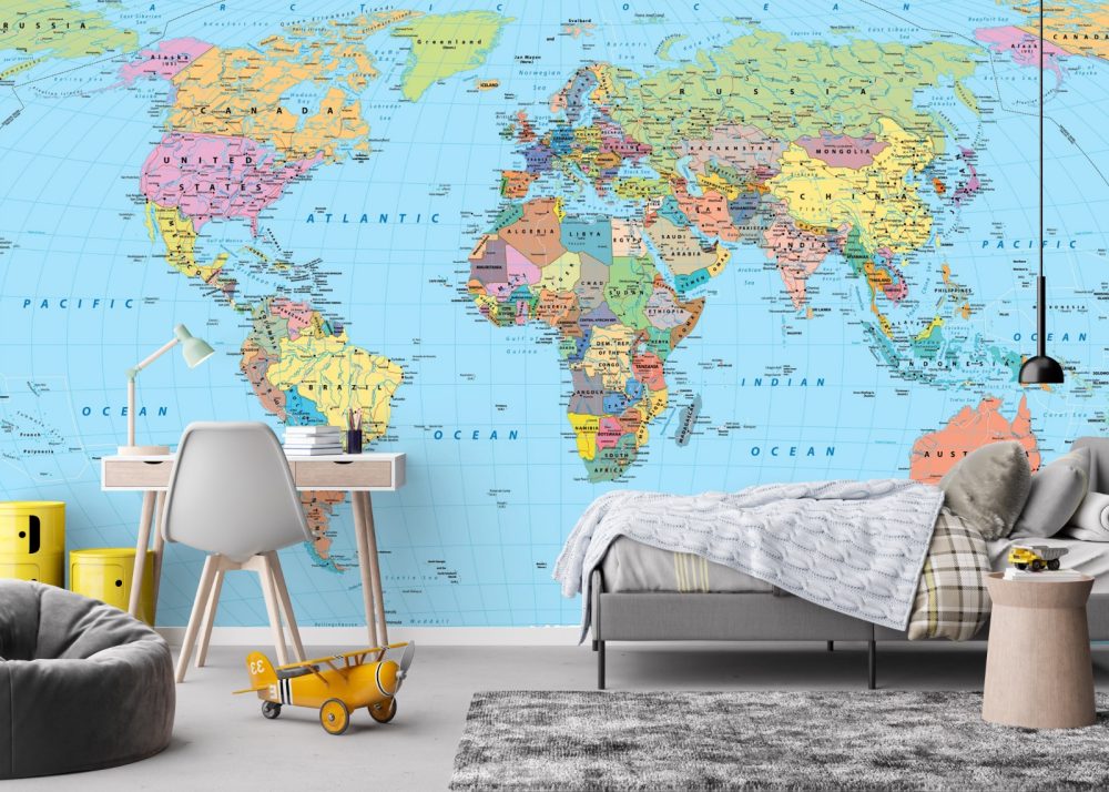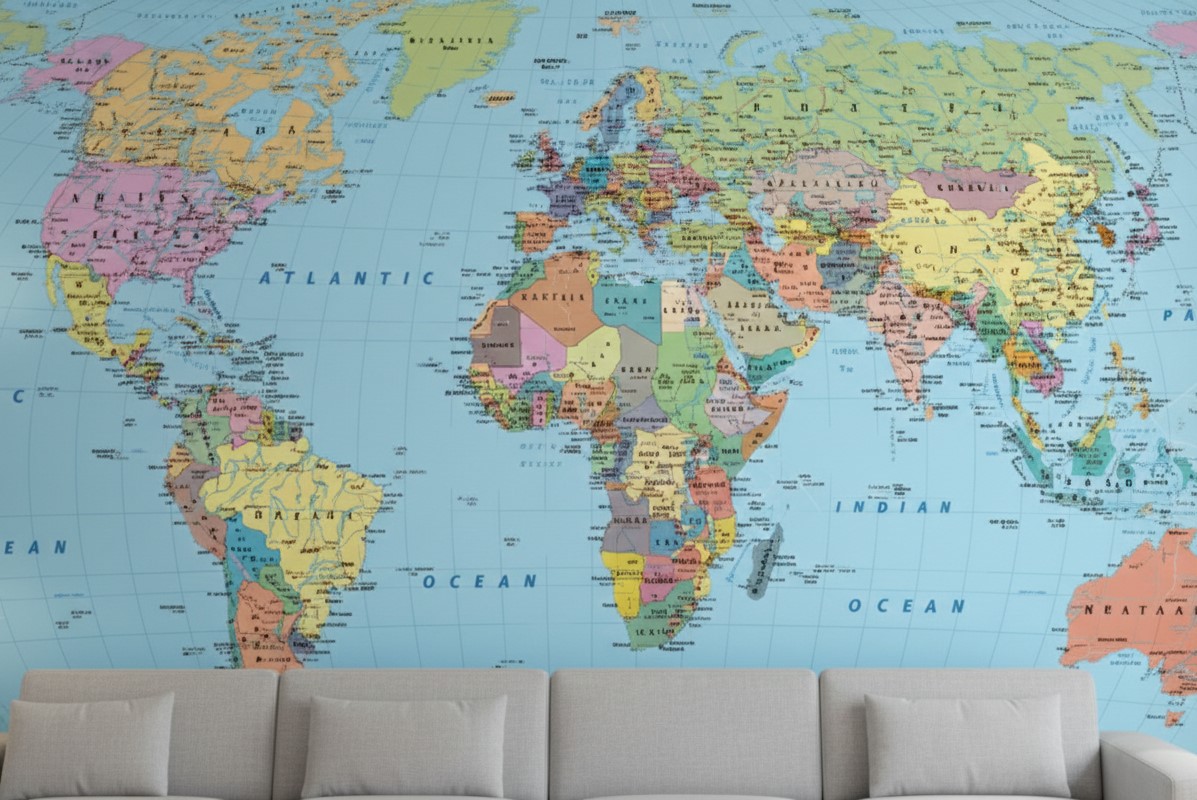 Bring a touch of traditional cartographic charm to your space with the Classic Blue Atlas World Map Mural. Unlike minimalist maps, this design offers a fully detailed political projection where every country is clearly defined in contrasting shades of pink, orange, yellow, and green.