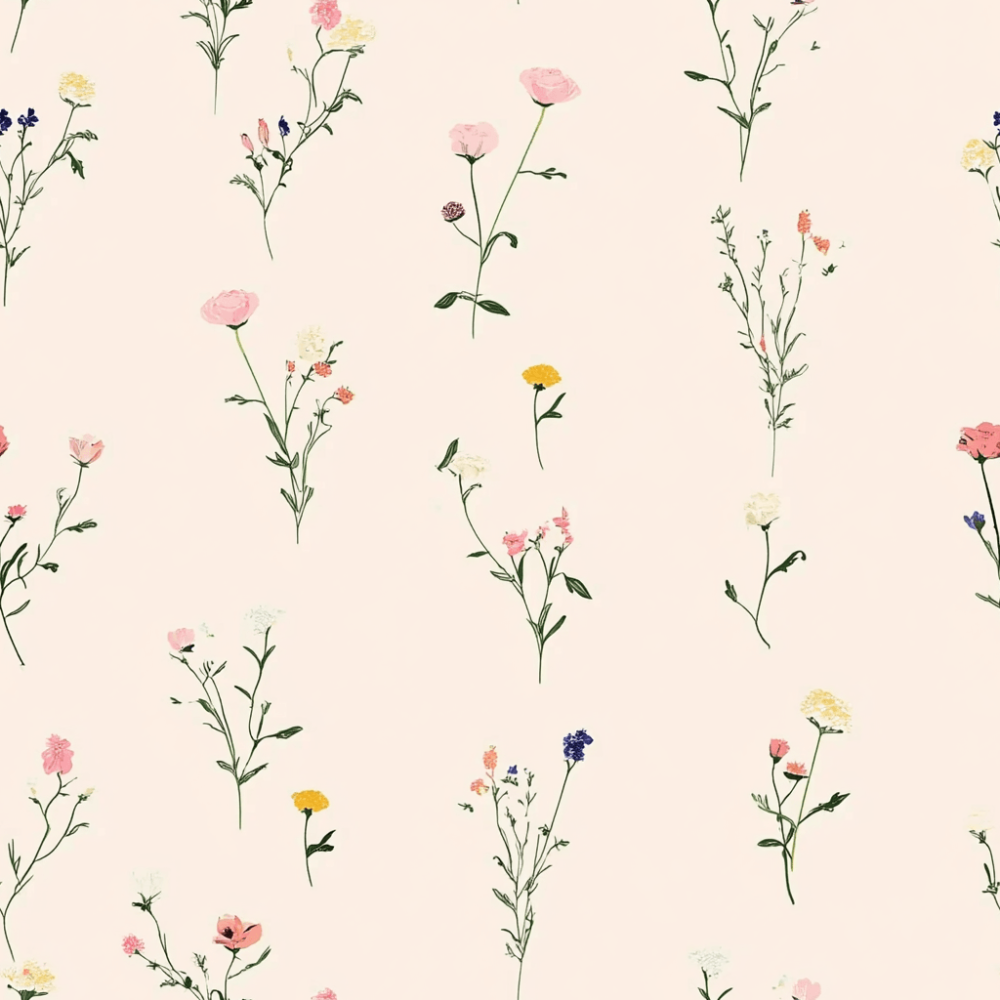 Bring the quiet charm of a botanical field guide to your walls with the Dainty Meadow Bloom Wallpaper. This sophisticated yet sweet design showcases individual flower stems “floating” in plenty of negative space, preventing the room from feeling cluttered. The hand-painted illustrations include petite poppies, daisies, and buds in soft shades of blush pink, buttercup yellow, and cornflower blue, all anchored by slender green stems.