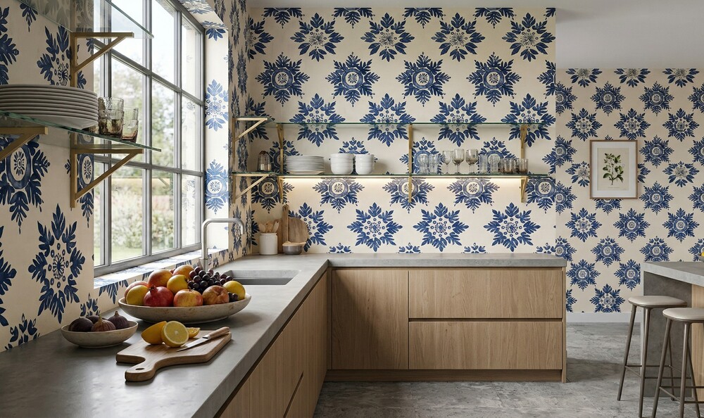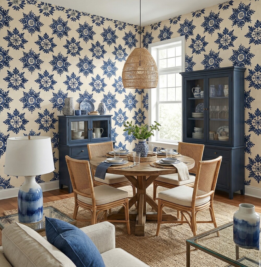 The deep indigo blue tones offer a stunning contrast against the warm, off-white background, mimicking the look of traditional Dutch Delftware or Mediterranean tilework. Perfect for creating a feature wall in a master bedroom, adding character to a powder room, or bringing a calm, creative energy to a home office. Whether your style is Coastal, Bohemian, or Classic Traditional, this wallpaper provides a sophisticated foundation that complements a wide range of textures and finishes.