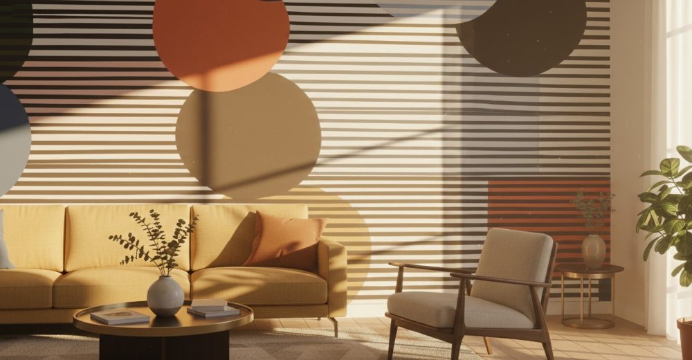 Redefine your interior with the Geo-Stripe Mural, a design where structured minimalism meets playful abstraction. This mural features a continuous backdrop of fine horizontal black-and-white stripes, disrupted by large, overlapping circular motifs in a curated palette of terracotta, cobalt, and slate.