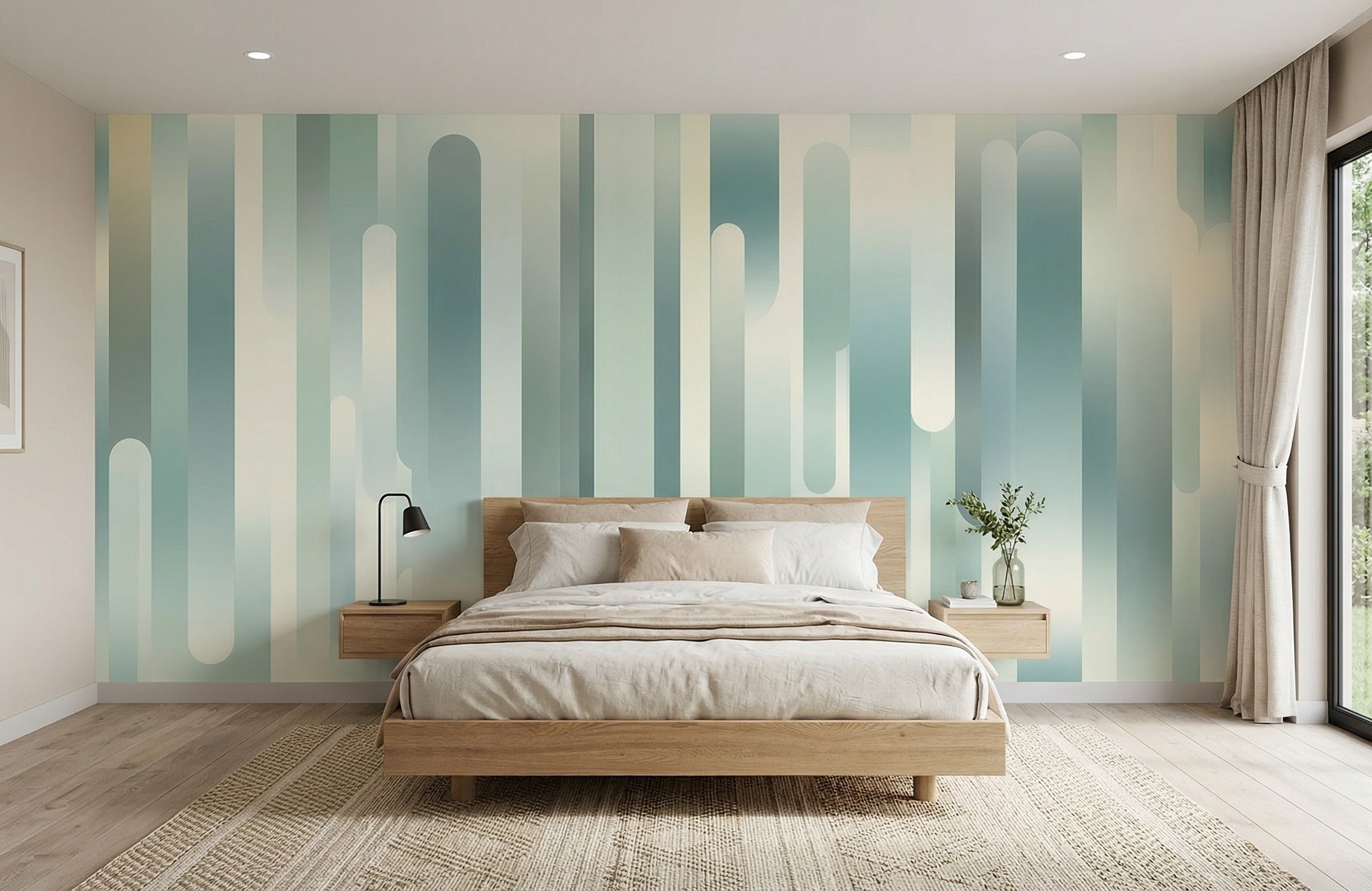 Elevate your interior design with the Glacial Stream Mural, a masterclass in contemporary minimalism. This artwork utilizes a unique “pill” or capsule-style geometric pattern, where varying widths and heights create a sense of rhythmic movement and verticality.