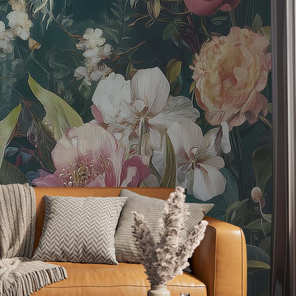 The Green Eden Mural captures the richness of the tropics with hand-drawn banana leaves, orchids, peonies, and exotic blooms. Set against a deep emerald backdrop, it creates a lush, atmospheric escape for South African interiors. Ideal for feature walls in Johannesburg apartments, Cape Town homes, or Durban villas.