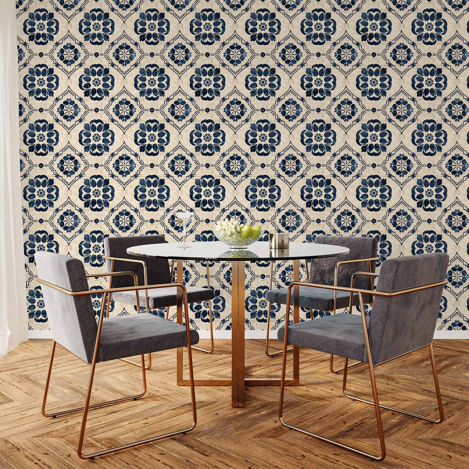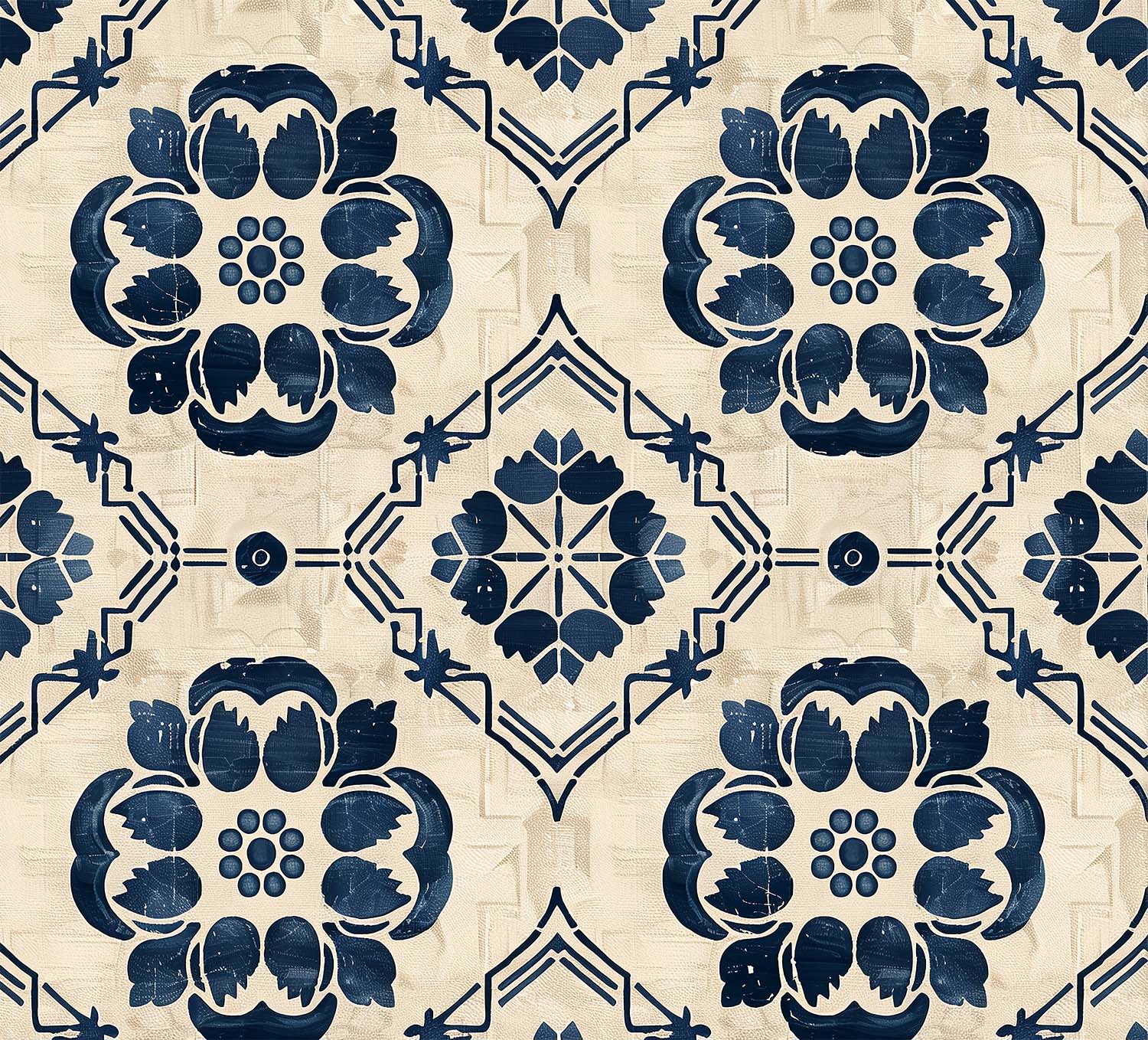 This wallpaper features a classic Iberian tile-inspired pattern with navy blue floral and geometric motifs set against a warm beige textured background. The design evokes a hand-painted, artisanal feel — perfect for adding Mediterranean charm and timeless elegance to kitchens, bathrooms, or accent walls.