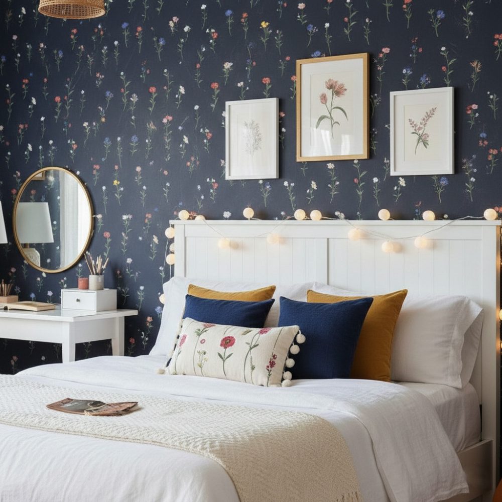 Make a bold statement with the moodier sister to our Dainty Meadow design. The Midnight Meadow Bloom Wallpaper captures the romance of a wildflower field at dusk. The deep midnight blue backdrop provides a stunning high-contrast canvas that allows the vibrant jewel tones of the flowersโ€”ruby red, cornflower blue, sunny yellow, and crisp whiteโ€”to truly pop.