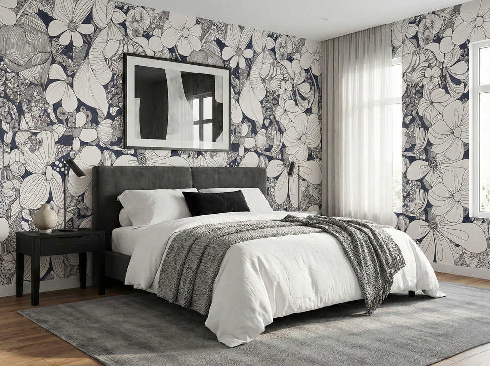 The monochromatic palette offers incredible versatility; it provides a dramatic backdrop for neutral furniture and warm wood tonesโ€”as seen in mid-century modern bedroomsโ€”or acts as a grounding element in a colourful, maximalist living space. Whether you are looking to add depth to a master suite in Toronto, a chic living area in New York, or a boutique guest room in Cape Town, this wallpaper delivers timeless elegance with a contemporary edge. The detailed line work draws the eye, making it an ideal choice for a statement wall that sparks conversation.