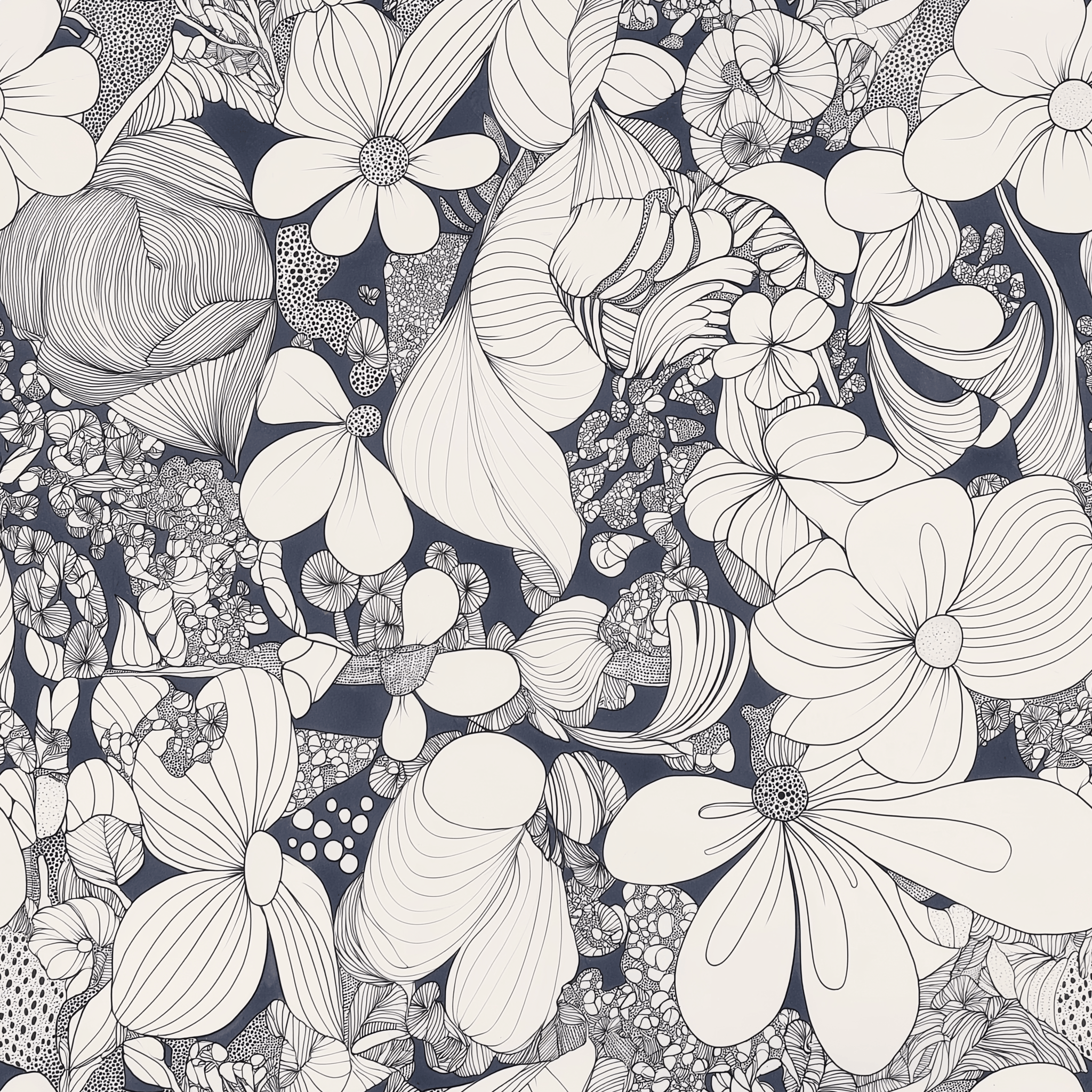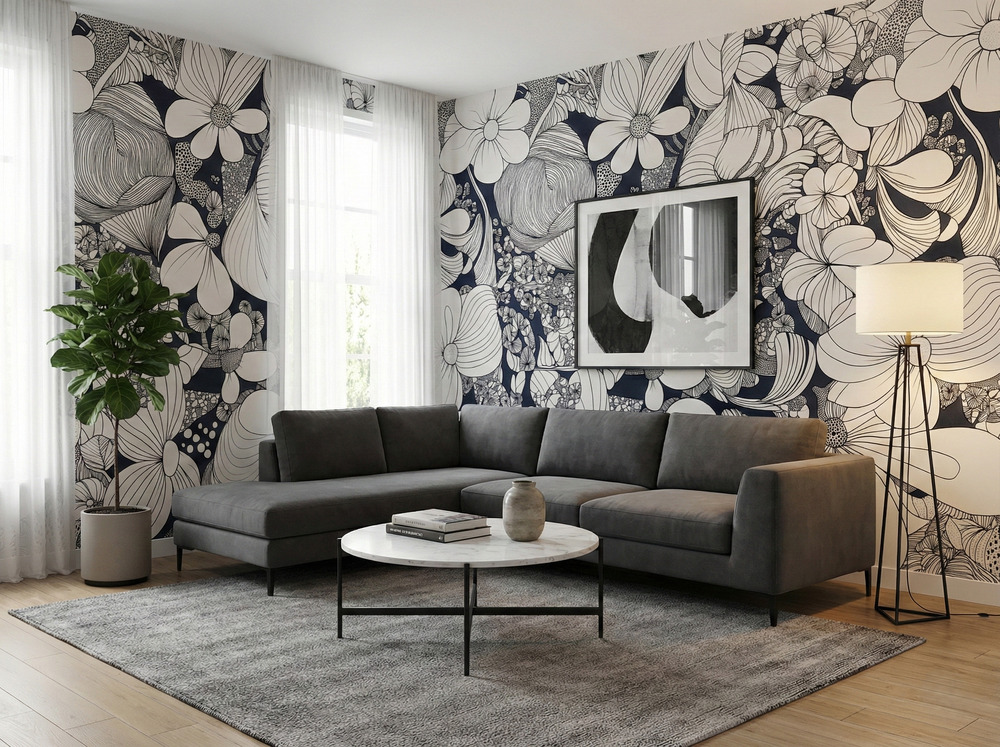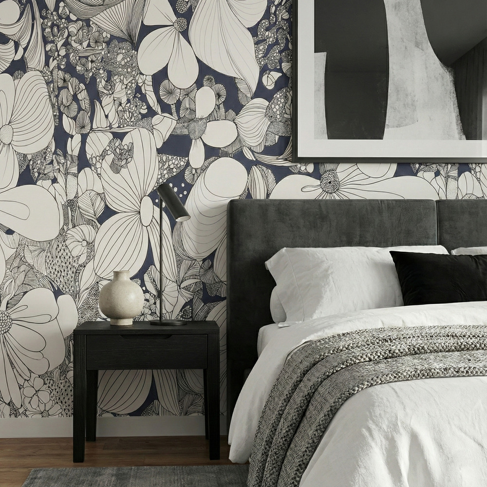 Transform your interior into a modern masterpiece with the Noir Botanical Mural. This design moves away from traditional florals, embracing a graphic, avant-garde aesthetic that mimics the intricate detail of a hand-drawn sketchbook. The pattern features oversized blooms, sweeping leaves, and abstract organic shapes rendered in crisp black lines against a clean white background.