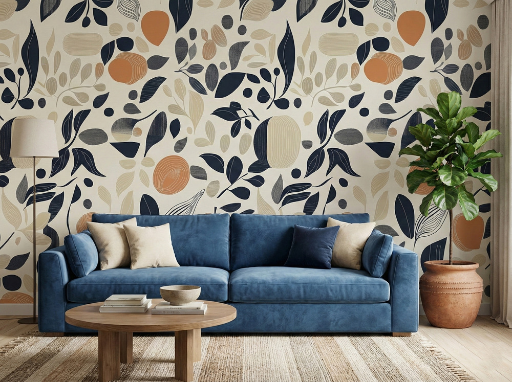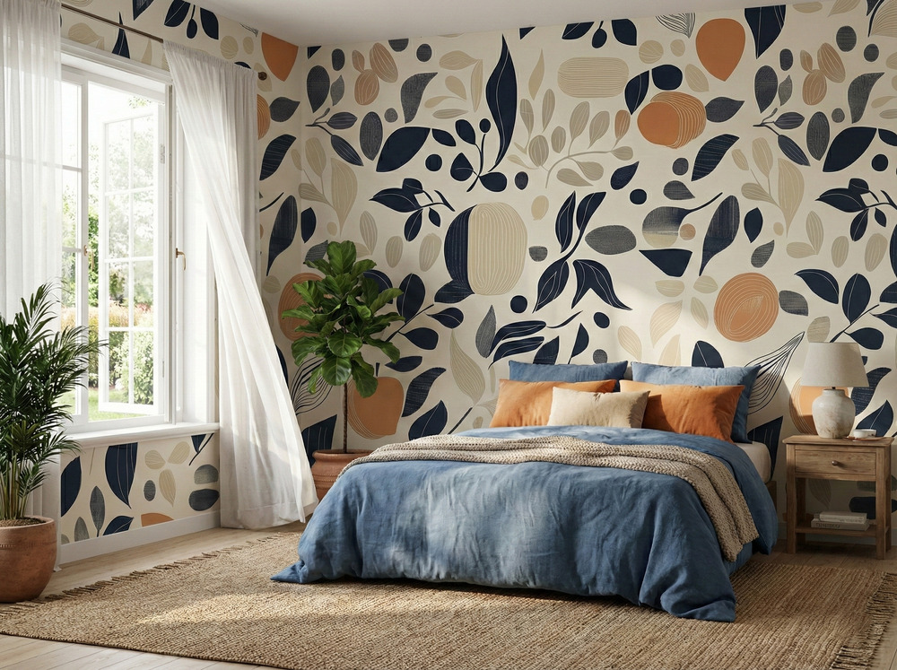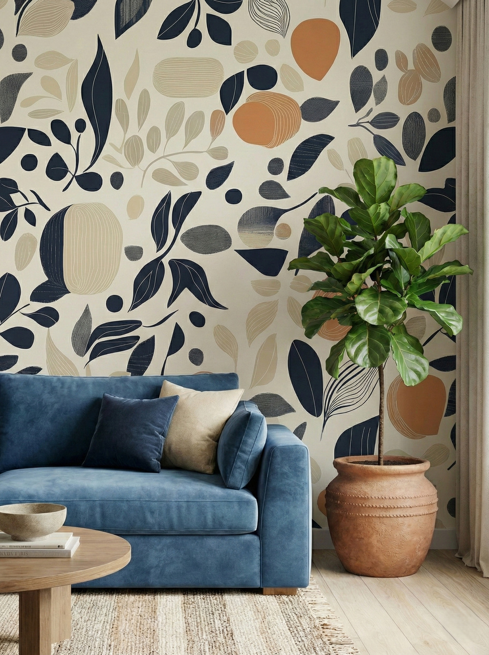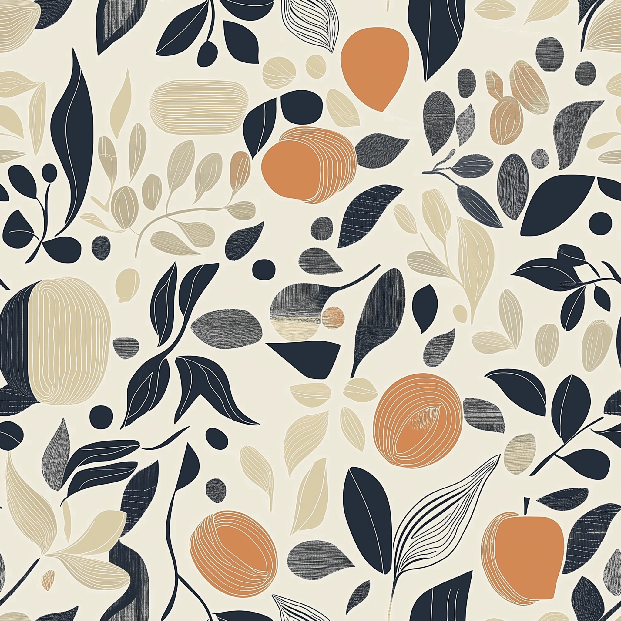 Transform your space into a modern sanctuary with the Nordic Harvest Wallpaper. This design masterfully blends mid-century modern aesthetics with contemporary Scandinavian style, featuring a collage of stylized foliage, abstract fruit shapes, and organic cut-outs.