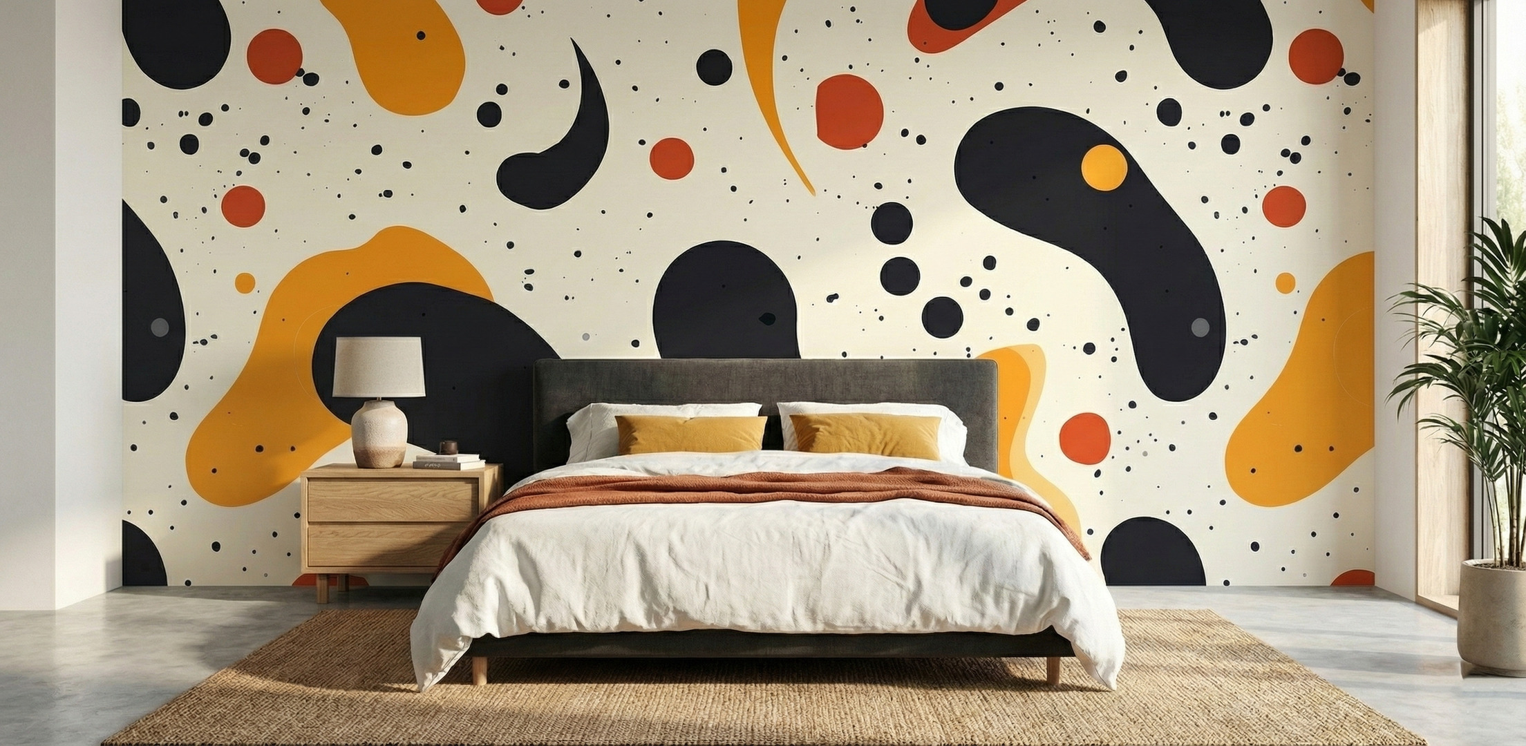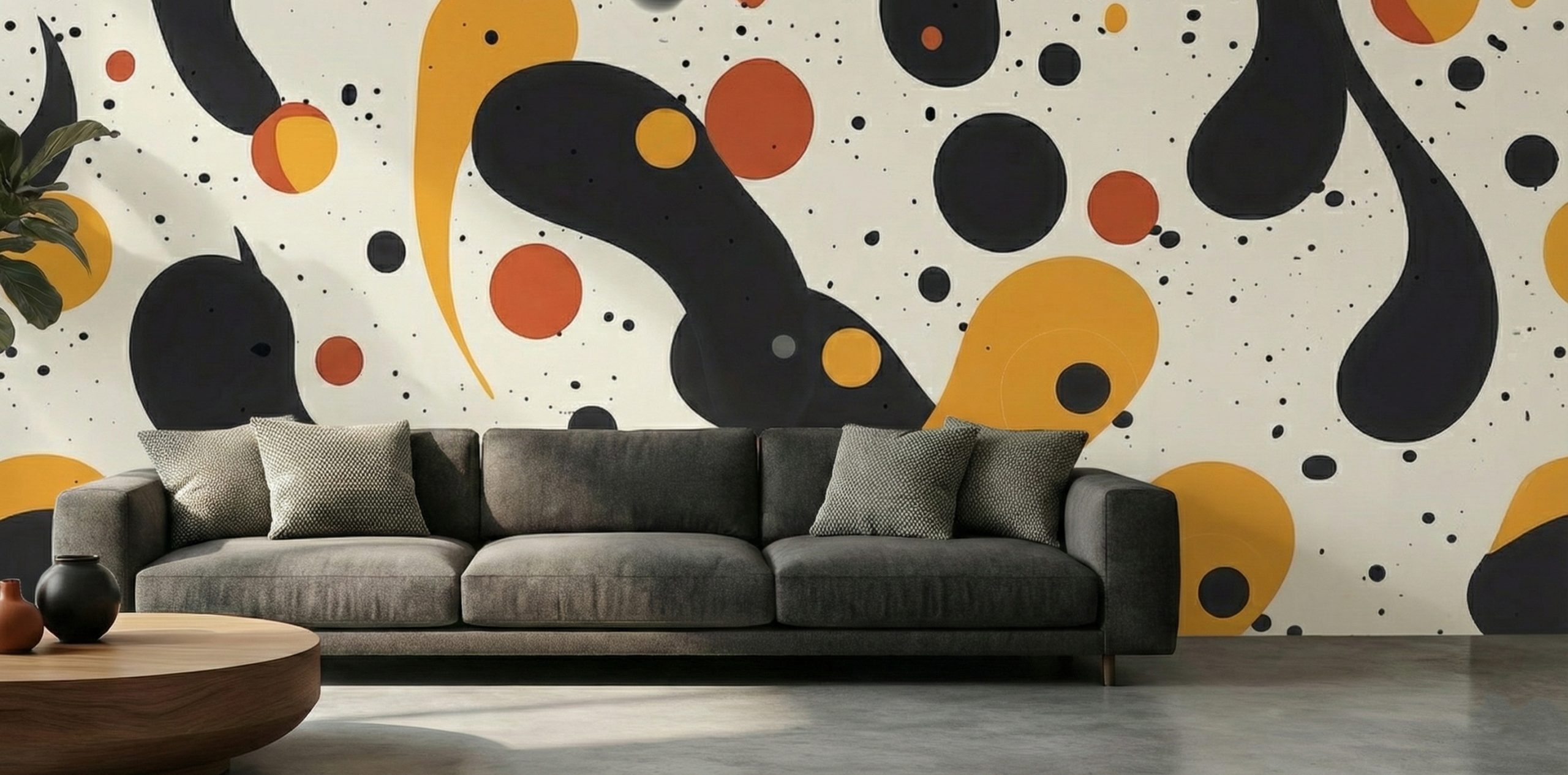 Transform your walls into a canvas of modern art with the Organic Pebble Terrazzo Mural. This design captures the essence of the retro-revival trend, blending the nostalgic charm of mid-century aesthetics with the boldness of the Memphis design movement. The artwork features large, fluid, amoeba-like shapes in a striking colour palette of deep charcoal black, warm mustard yellow, and earthy burnt orange.