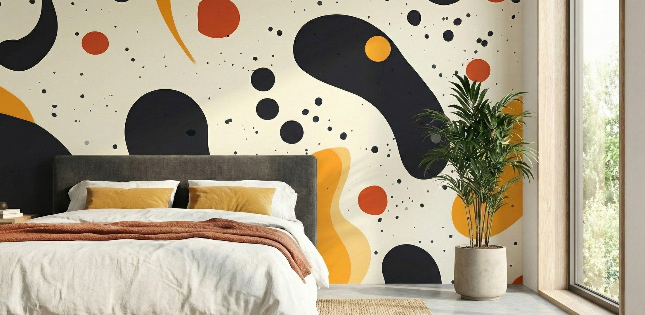 Set against a soft, off-white cream background, the design is detailed with fine black speckles and dots, mimicking the texture of natural stone, ceramic splatter, or terrazzo flooring. This organic, fluid pattern creates a sense of movement and creativity, making it a versatile choice for various interiors. It is particularly well-suited for a gender-neutral nursery, a funky kids’ playroom, a creative studio space, or a contemporary living area that needs a warm, artistic focal point.