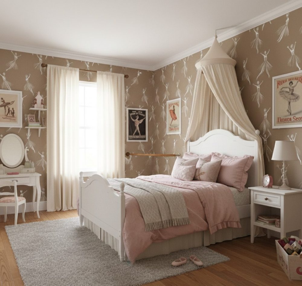 The muted mocha-taupe backdrop offers a refined and mature alternative to traditional dance-themed decor, allowing this wallpaper to transition beautifully from a young dancerโs bedroom to a sophisticated dressing room or creative studio. The earthy, neutral tone provides a cozy warmth that perfectly complements white trim, natural wood furniture, or metallic gold accents. It is an enchanting choice for those looking to inspire a sense of poise, beauty, and creativity within their home.