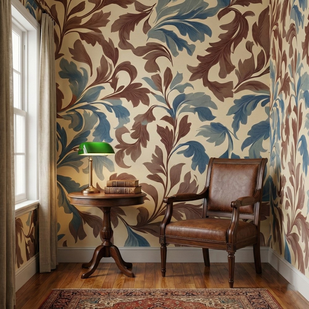 The intricate detailing within the leaves mimics the look of a woven tapestry or vintage fabric, adding perceived texture and depth to your walls. Ideally suited for a study, a cozy living room, or a traditional hallway, this wallpaper offers a sense of movement and organic beauty without overwhelming the space. It is the perfect choice for those seeking to blend vintage aesthetics with modern color sensibilities.