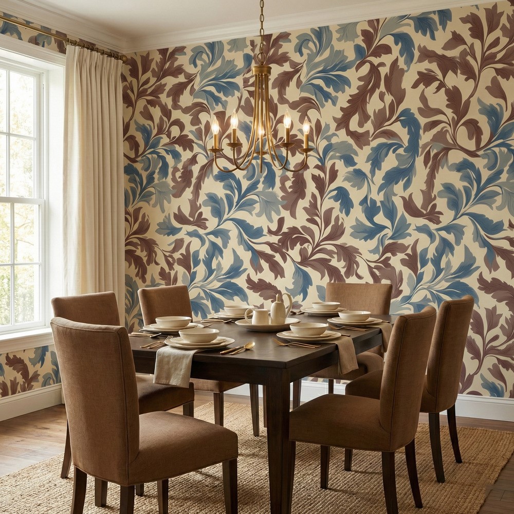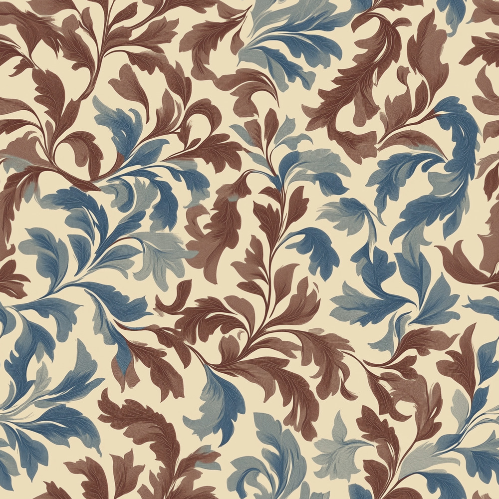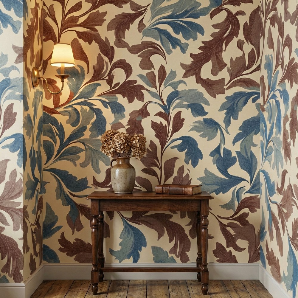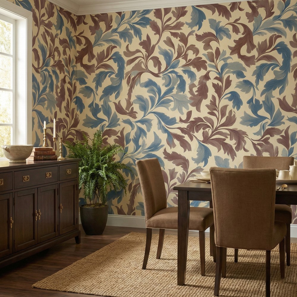 Evoke the heritage and charm of the Arts and Crafts movement with the Russet Scroll Wallpaper. This sophisticated design features a rhythmic, flowing pattern of stylized acanthus leaves and scrolling vines. The color palette strikes a perfect harmony between warm and cool tones, showcasing earthy russet and chocolate browns alongside dusty denim and slate blues, all set against a soft, warm cream backdrop.