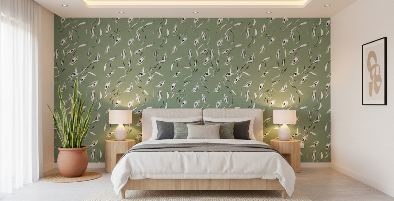 The background is a sophisticated, matte sage green that provides a grounding, earthy foundation. This design balances modern minimalism with artistic craftsmanship, making it an ideal feature wall for a tranquil bedroom, a home office, or a contemporary living area seeking a touch of the outdoors.