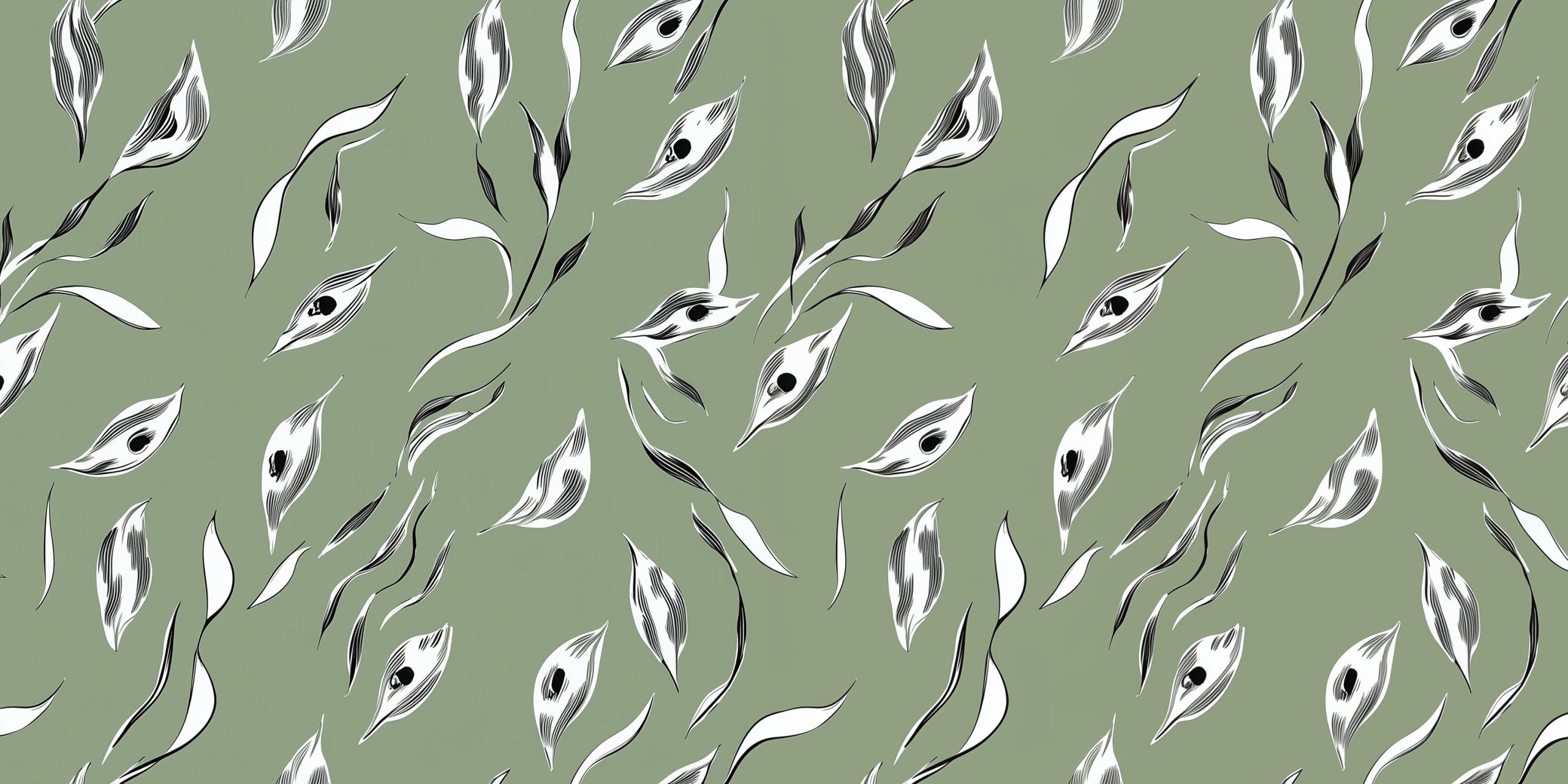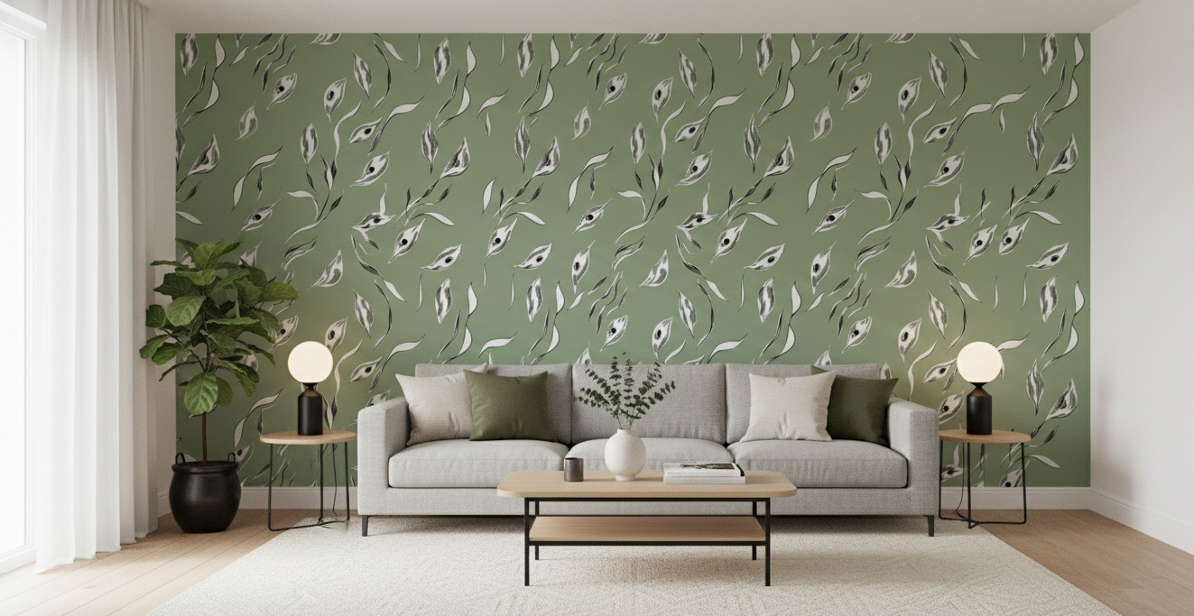 Create a breezy, nature-inspired sanctuary with the Sage Windswept Foliage Mural. The artwork captures the gentle movement of falling leaves or floating seed pods caught in a soft wind. Each botanical element is depicted in crisp white with delicate black ink detailing, resembling the texture of a traditional linocut or woodblock print.