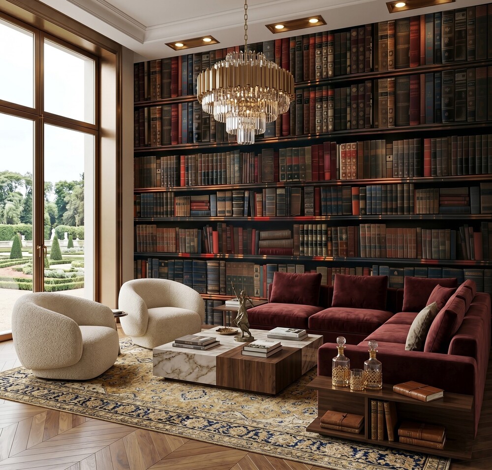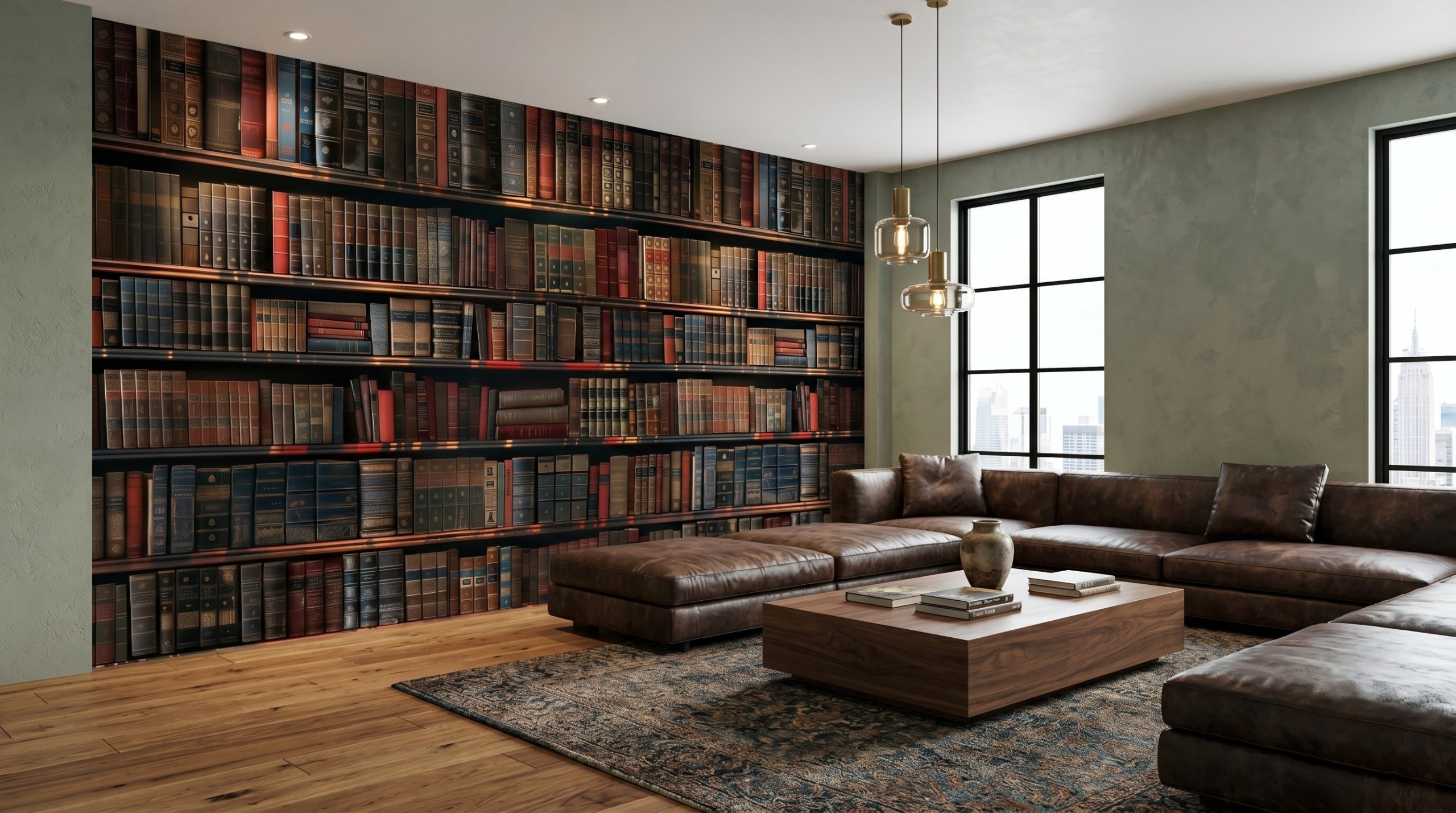 Step into a world of wisdom and heritage with the Scholarly Sanctuary Mural. This deeply immersive mural creates the ultimate illusion of a private, ancient library, featuring rows upon rows of textured wooden shelves filled to capacity with a vast collection of aged volumes. The rich details of worn leather spines, embossed gold titles, and varied book heights give the mural an undeniable depth and authenticity.