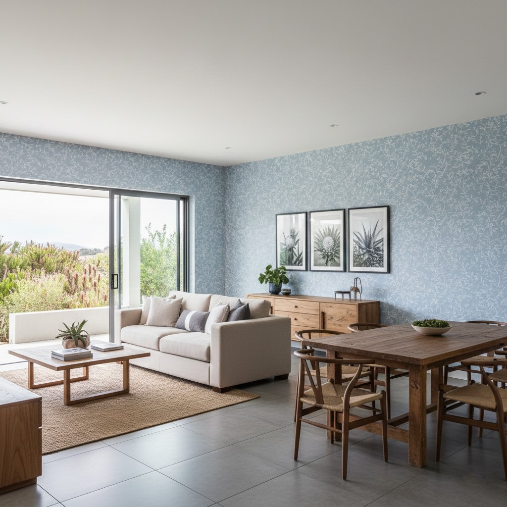 The background is a soft, matte powder blue that instantly brightens a room while maintaining a restful vibe. The gentle, wandering movement of the botanical lines draws the eye without overwhelming the space. This design is exceptionally versatile, making it a perfect backdrop for a peaceful nursery, a coastal-inspired living room, or a light and airy bedroom. It pairs effortlessly with white crisp linens, natural oak furniture, and woven textures.