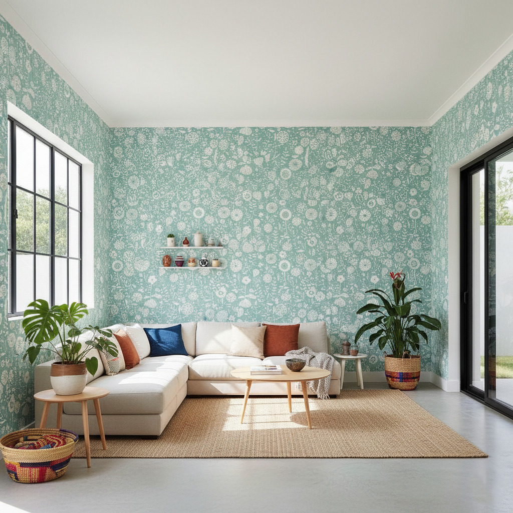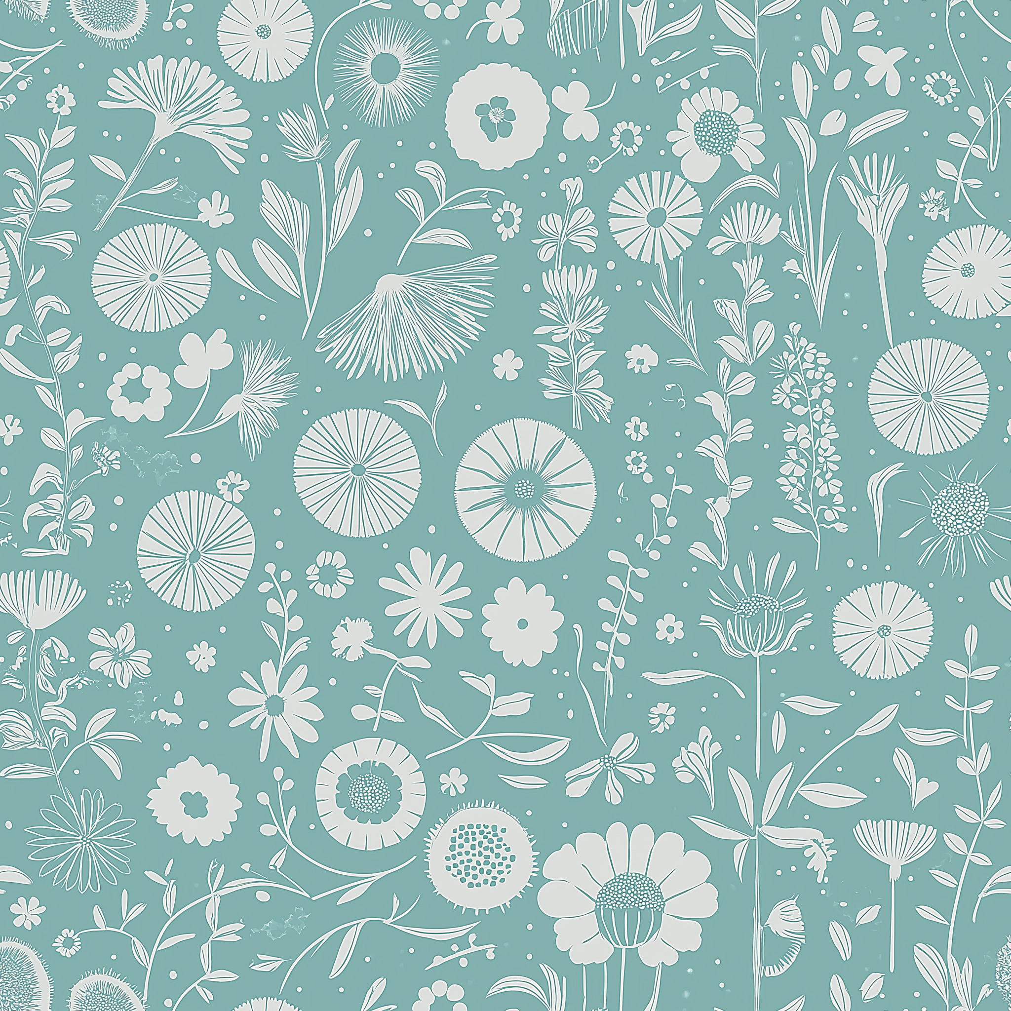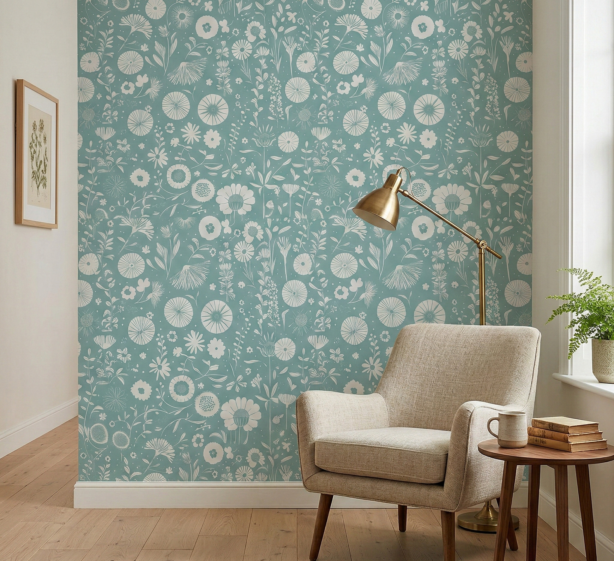 This wallpaper presents a playful yet sophisticated folk-art style botanical pattern. The seamless repeating design showcases a variety of delicate wildflowers, stylized daisies, and leafy stems rendered in a soft off-white hue against a calming aqua-teal backdrop. Tiny dotted accents add subtle texture to the overall composition, making it an ideal choice for a nursery, bathroom, or cottage-inspired space.